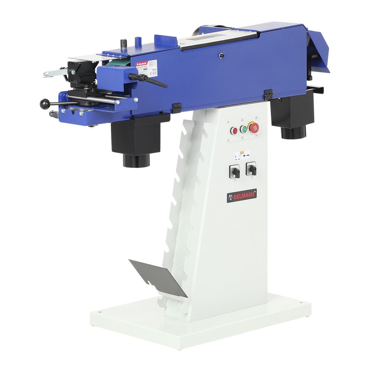 На опоре находятся кнопки аварийного выключения станка, ручка регулировки скорости движения шлифовальной ленты и переключатель направления движения ленты.